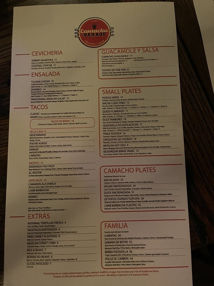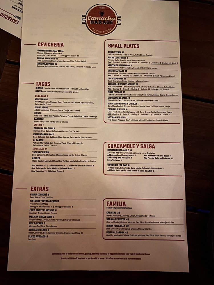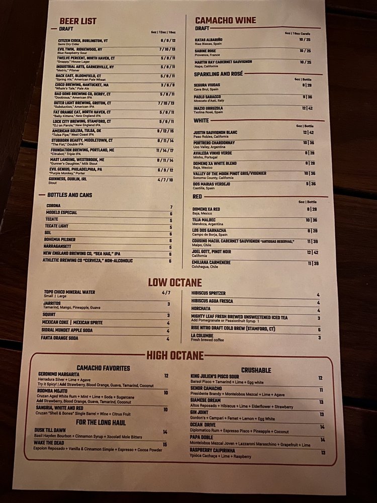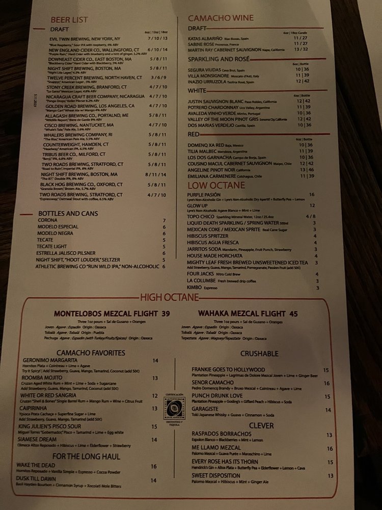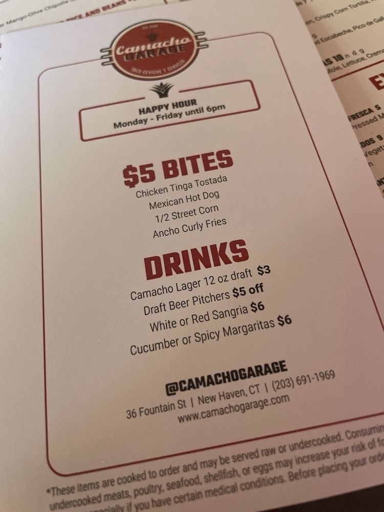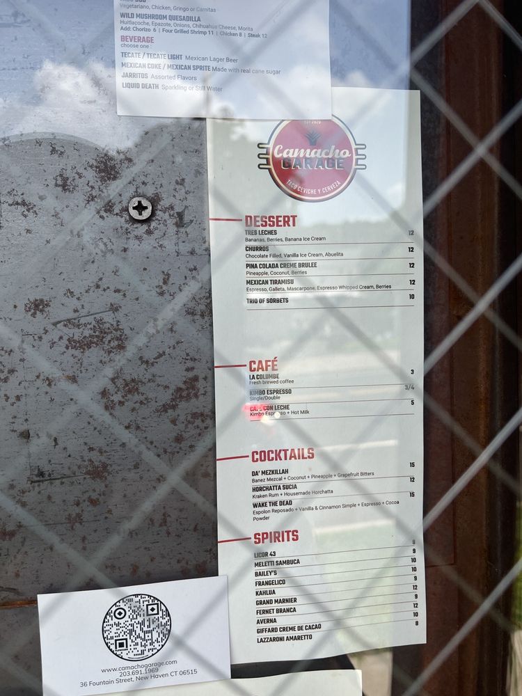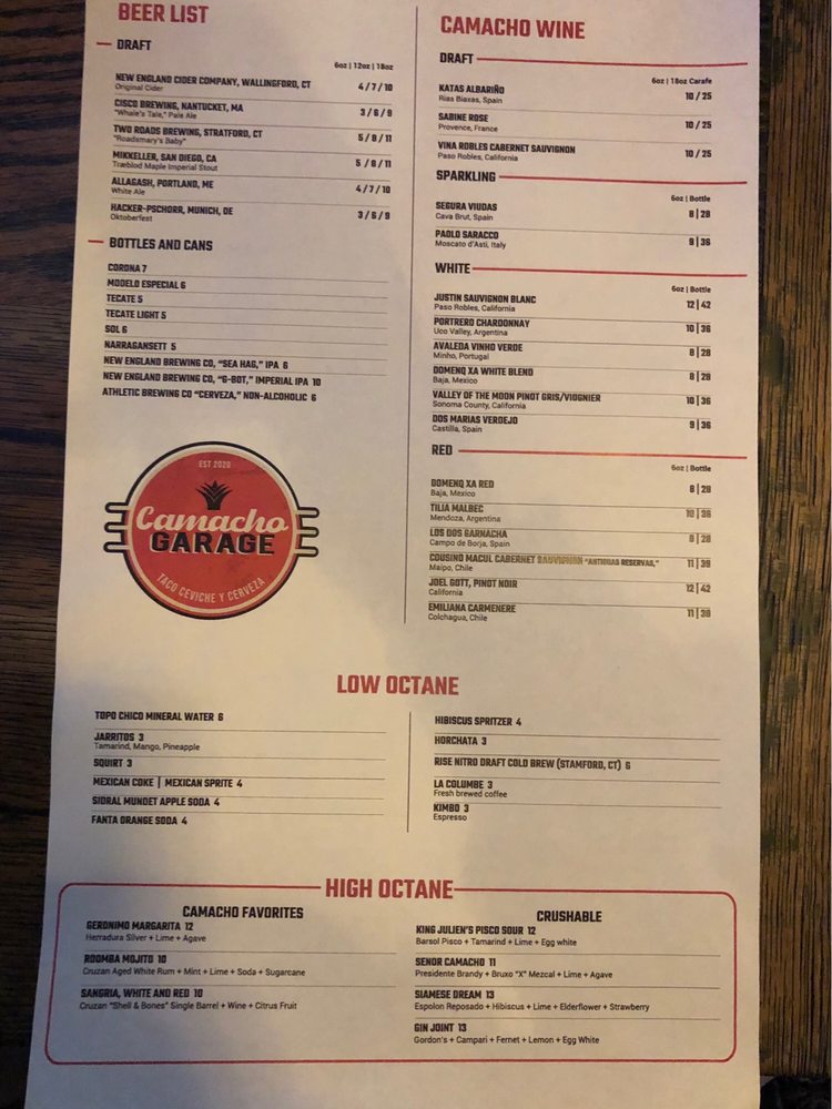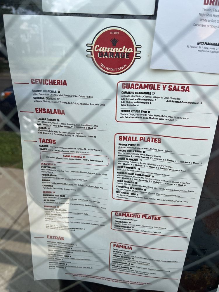 Camacho Garage, a trendy Mexican restaurant located in New Haven, CT, offers a diverse menu with options for everyone. From their Herb Guacamole to their refreshing Watermelon Ensalada, each dish is carefully crafted with fresh and flavorful ingredients. The Cevicheria section features unique options like Shrimp Aguachile and Ceviche de Nopales Hongos, showcasing the chef's creativity. The restaurant also offers outdoor seating, making it a great spot for a casual dinner or dessert. The lively atmosphere, full bar, and happy hour specials add to the overall experience. With ample parking and wheelchair accessibility, Camacho Garage is a must-visit destination for Mexican cuisine lovers in the area.